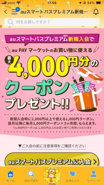 auひかりで使っているauIDでauスマートパスプレミアムを契約したところ、クーポン取得のための回線認証が通らずに苦戦・・・。povoなのでau回線の認証が通らないのは当たり前なのですが、この画面では得に説明もなかったので何度も試してしまいました。結論としては、auではない人はここで認証を行う必要はなく、aupayアプリからクーポン取得ということでした。au使っていない方は注意が必要です。