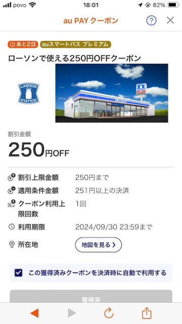250円のローソン250円offクーポンでした。入会から30日間は利用料無料、その後は1ヶ月単位で料金が発生ということでしたが、無料期間中も通常通りのクーポンがもらえるようですね。ただ、このクーポンをもらうのに少々時間を要してしまいました。
