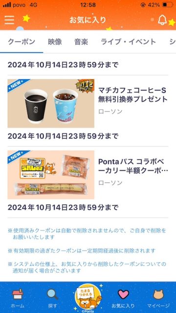 Pontaパスに切り替わって、マチカフェコーヒーとコラボベーカリークーポンをもらいましたが、どちらも全員もらえます。コーヒーは120円、パンは214円が半額ですので107円の割引です。大きなピザパンは温めて食べた方が美味しいです!