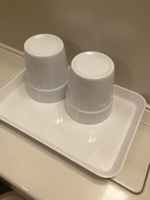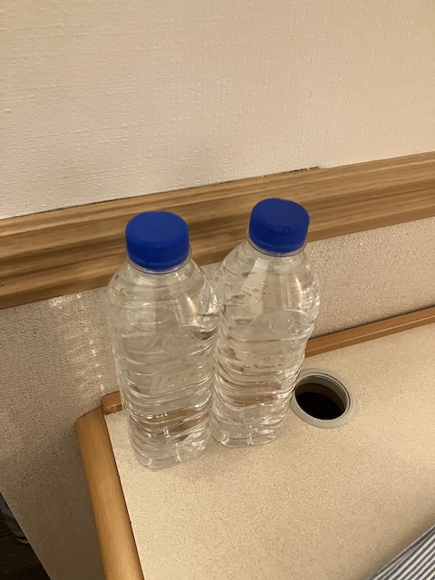 水のボトルが2本/日配布されます。こちらでは、足りないのでコンビニなどで買い足すか、ボトルを持参してロビーでいれるか??が必要ですね。ペットボトルはとっても薄いタイプです。テレビは、NHKプレミアムが映りますので紅白歌合戦もゆく年くる年も時差なしで視聴できました。