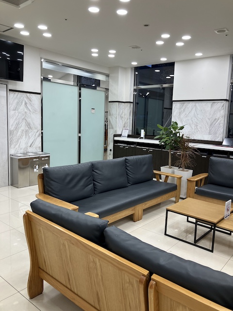 ロビーは日本の東横インより広々しています。食堂が2階なので、テーブルと椅子がなく、ソファが置かれているため??