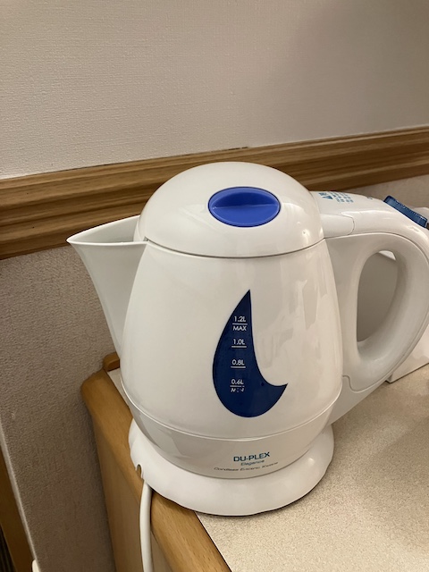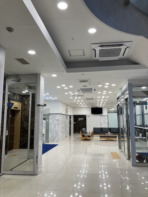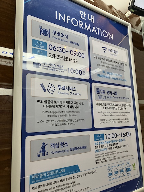 電子レンジ、計り、給水機、自動販売機、コインランドリーは1階です。LCCの多い韓国では計りは重要ですね。化粧水、乳液、洗顔、固形石鹸、お茶のティーバッグはフロントでいただけますが、歯ブラシと髭剃りは別途購入が必要です。