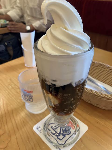 珈琲ジェリーはソフトクリームとコーヒーゼリーとバナナが一度に楽しめます。バナナ、意外な組み合わせですがなかなか良く合いますね。お隣の席では不動産売買契約中でしたが、個人情報なども気にせず、こんな所の契約でも良いのですねぇ。
