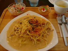 海老ときのこのパスタ840円。 湯で加減も塩加減もバッチリ! |