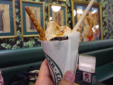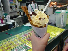 シルクソフトクリームです。 左はラムレーズン。 右はコーヒーゼリー。 さすが北海道のアイスは美味しいです。 フレークがやや多いかな。 |