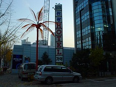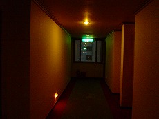ホテルの入り口の看板と廊下。 結構センス悪いです。 |