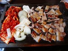 見てください。 この豚肉。一見油がすごいですが 焼いていくうちに流れていきます。 セットのお餅に包んで食べます。 |