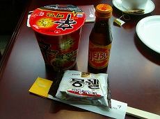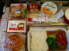 チャングムの誓い号。 機内食は昼ごはんかな? 往路の方が美味しかったけど 残さずたべます。 |