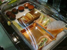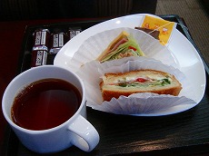 コーヒーが出来ると左の 呼び出し円盤が光って震えます。 コーヒー&サンドウィッチ (各4,800ウォン) サンドウィッチは新鮮で パンもふっくら。 |
