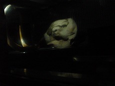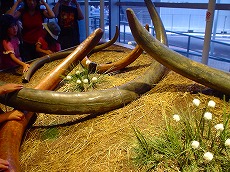 冷凍マンモスです! 噂どおり、動く歩道からの見学であっというまに 通り過ぎていきます・・・・。(T_T) それでも、必見です。感動します。動き出しそうです。 |