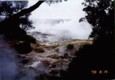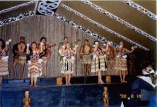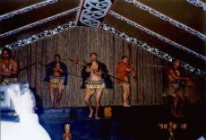 マオリの村では、毎日コンサートが行われています。ただし英語です。。。 マオリ料理(ハンギ?)も食べられます。 |