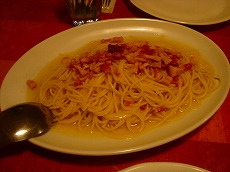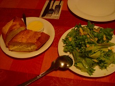 続いてサラダとフランスパン。 ペペロンチーノパスタ。 手作りの味わいです。 |